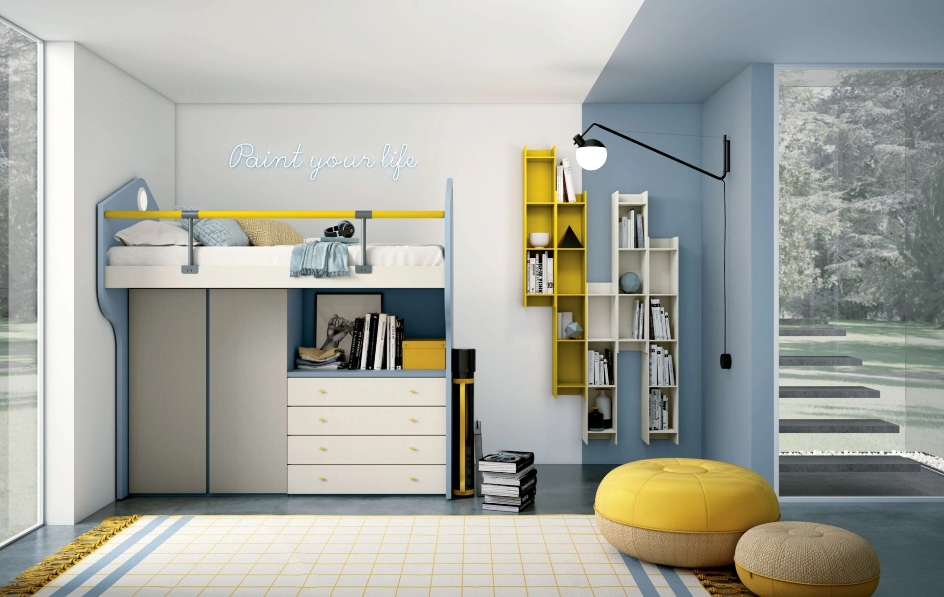 Porta estetica e colori vivaci nella stanza dedicata ai più giovani con questa proposta, una delle Camerette a soppalco per bambini di Mariani Plus. Questa proposta in melaminico ultima ottimamente le doti di funzionalità e l'estetica della camaretta, in quanto è capace di abbinare funzionalità ed ergonomia. Mariani Plus propone un ricco catalogo di accessori da comporre su misura: troverai letto, armadio, scrivania, sedie e librerie. Se cerchi idee creative per organizzare ottimamente la stanza dei tuoi figli, ti presentiamo la Cameretta Oblò di Mariani Plus con finitura in melaminico.