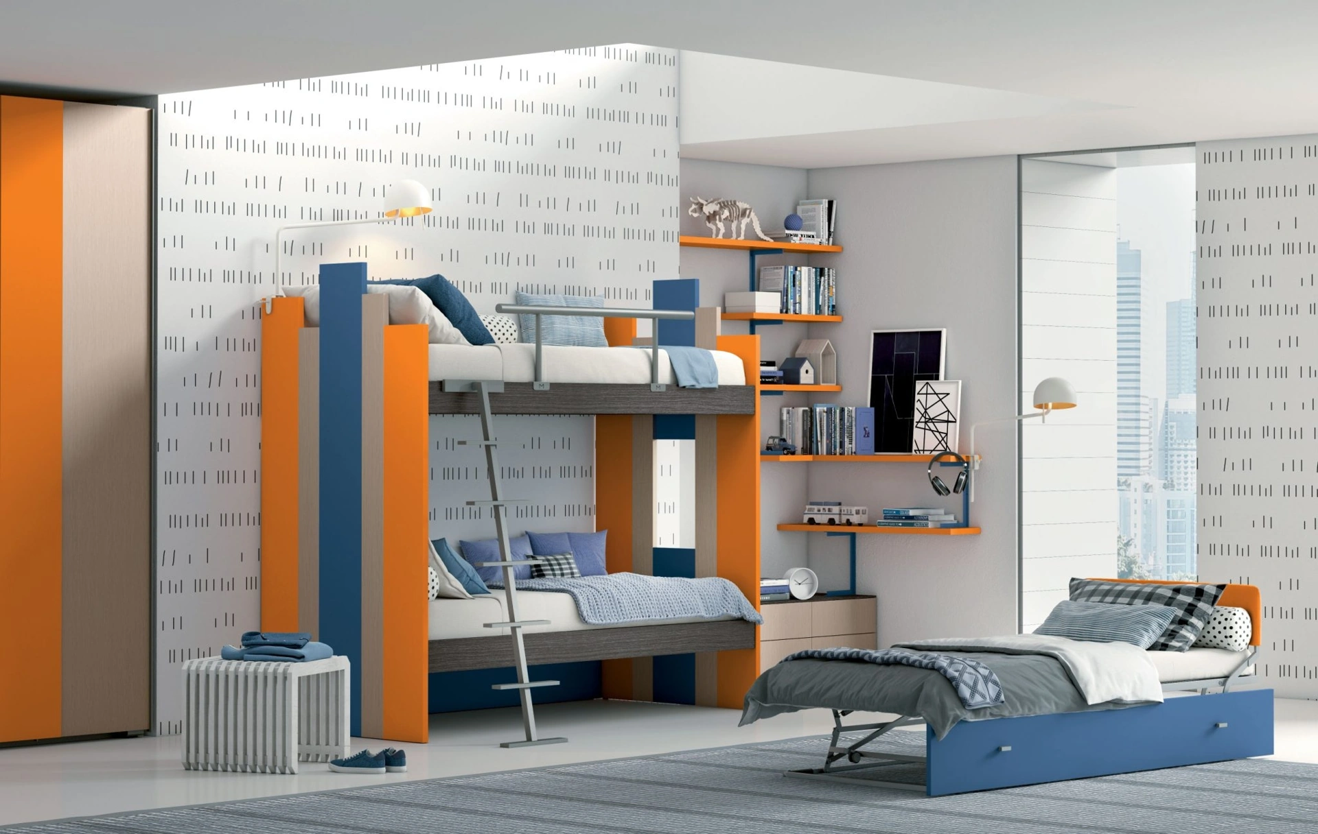 Nell'arredo della stanza dei giovani affidati a noi: in negozio proponiamo tutte le più esclusive composizioni arredative moderne per la loro camera. Porta estetica e tonalità vivaci nella stanza dedicata ai più piccoli con questa soluzione, una tra le Camerette con letti a castello per bambini di Mariani Plus. Se cerchi idee creative per decorare perfettamente la stanza dei tuoi figli, ti proponiamo la Cameretta con letti a castello Skyline di Mariani Plus con finitura in melaminico. Mariani Plus offre un ricco catalogo di elementi accessori da accostare su misura: troverai letto, guardaroba, scrivania, sedie e librerie.
