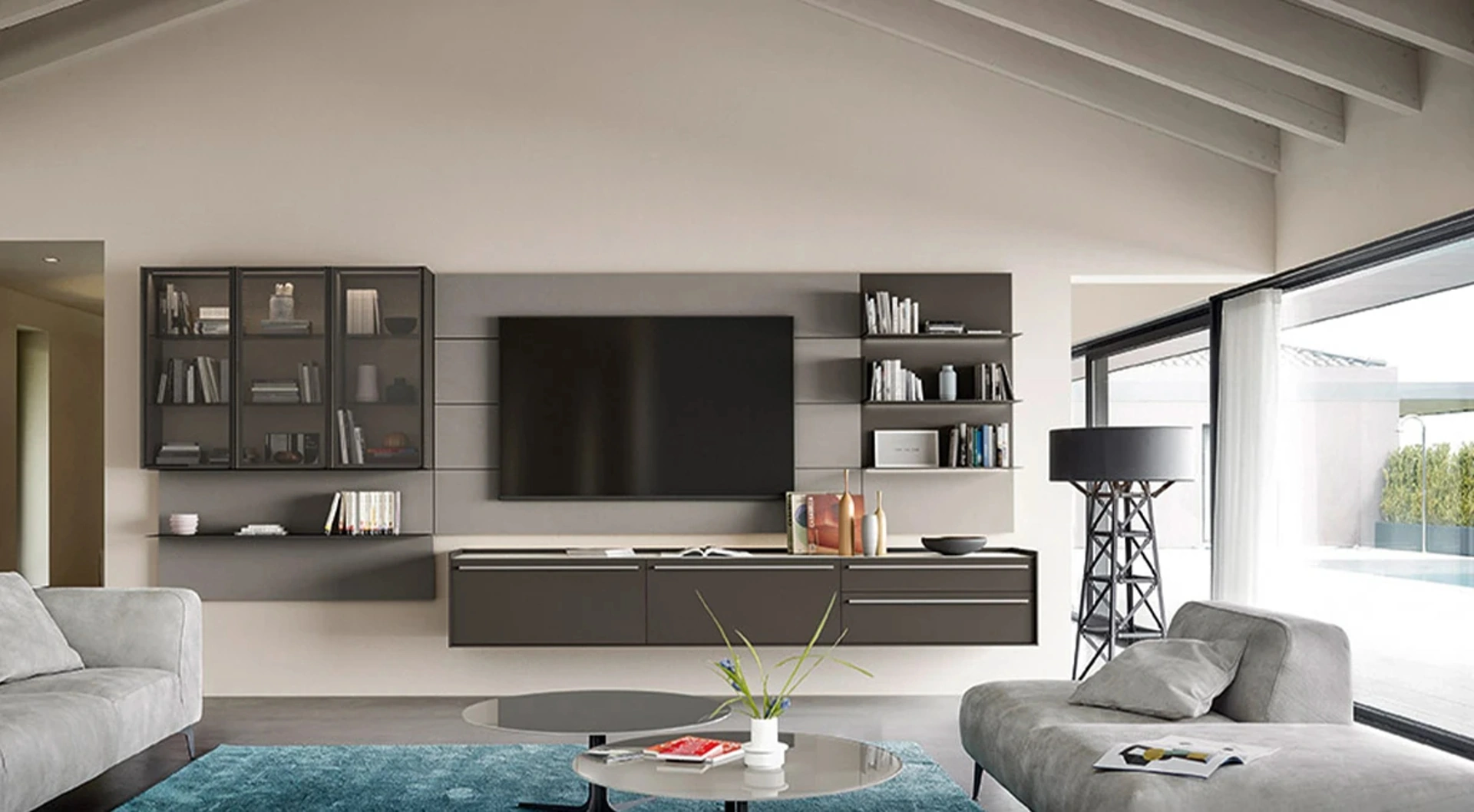 Vuoi arredare un living operativo e pratico? Ti presentiamo la parete attrezzata Cabaret One 02 Sangiacomo dalle forme decise moderne.